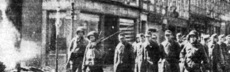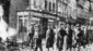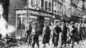 Im Bild ist zu sehen, wie Gefangene durch die Osterstraße gehen.